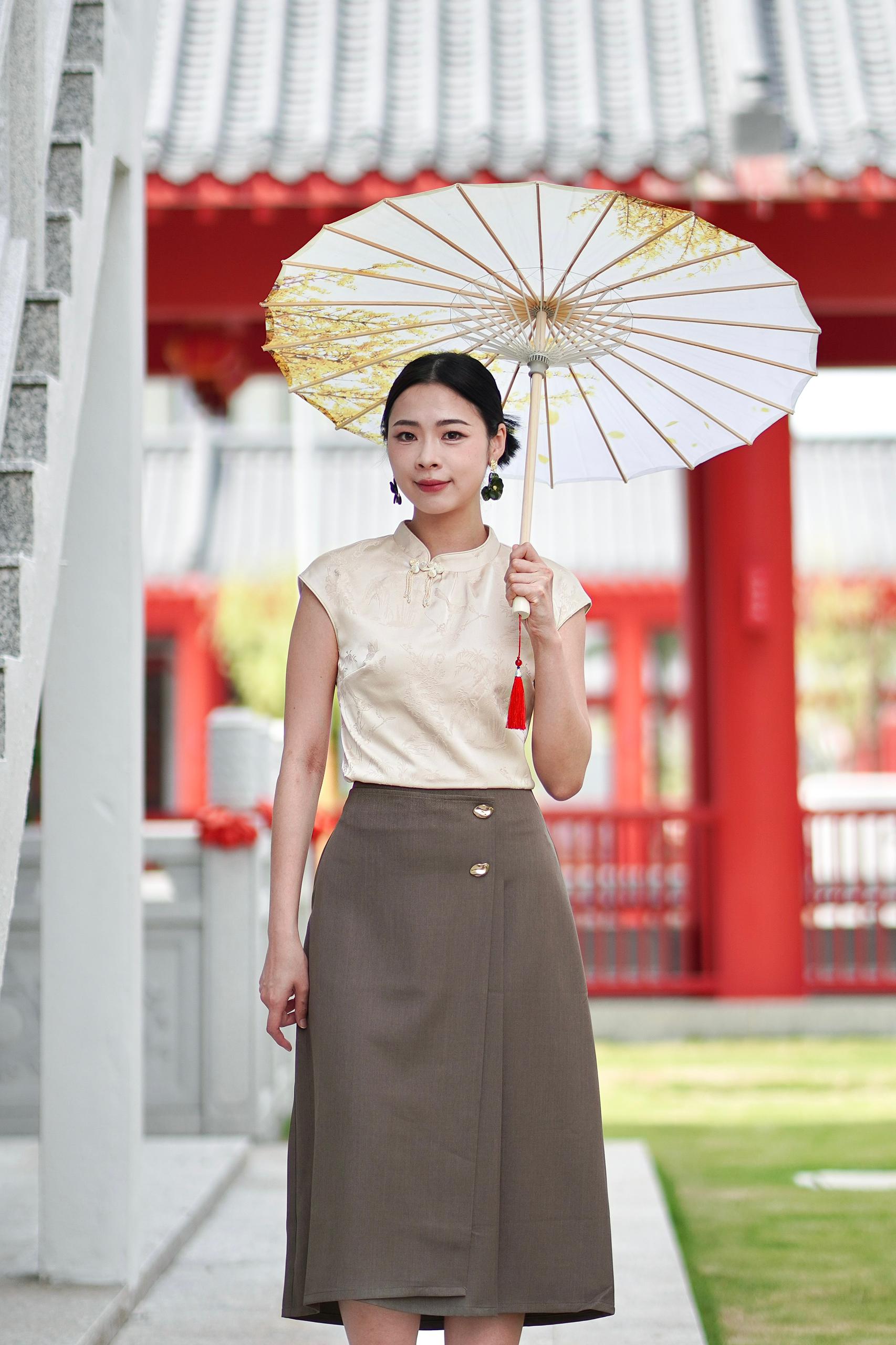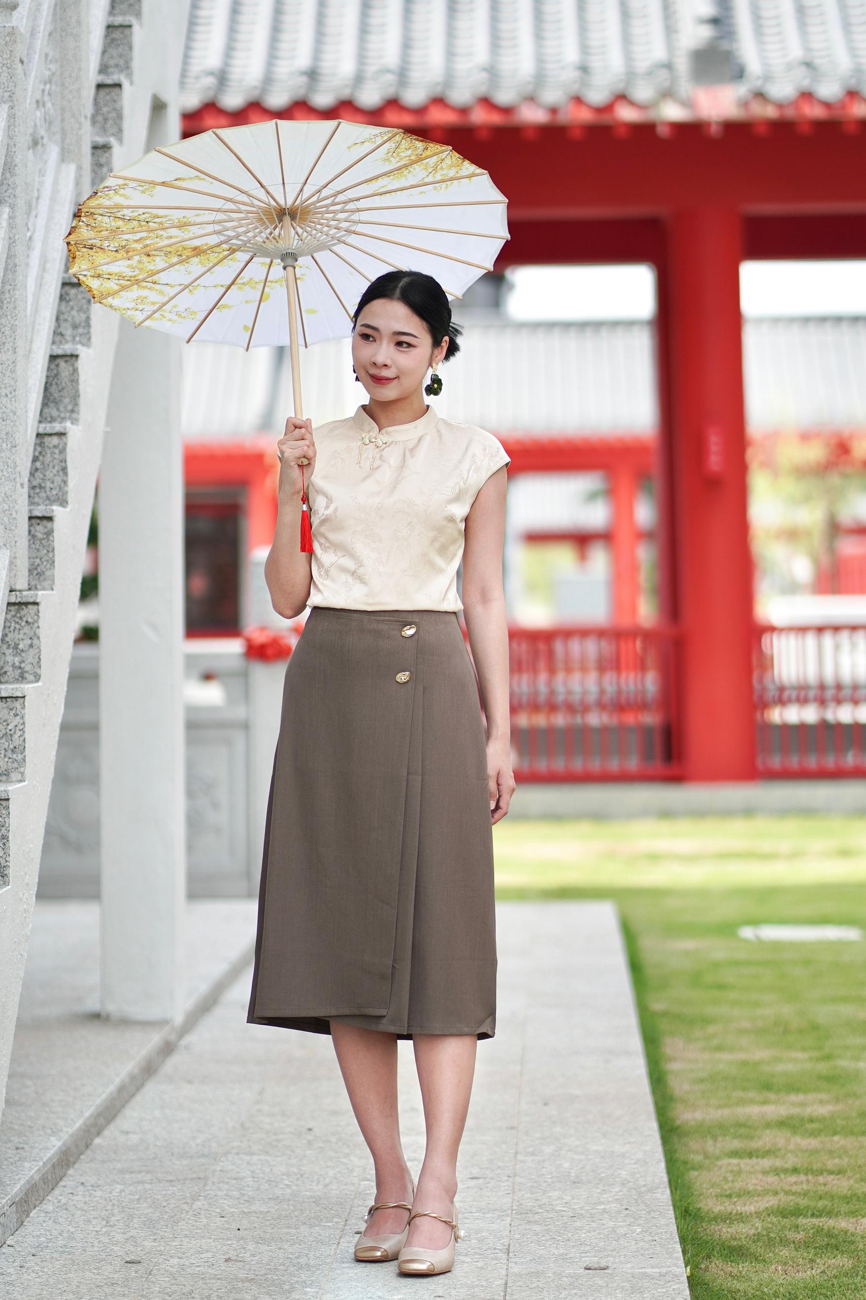 A softly structured midi skirt designed with a subtle wrap silhouette that flows naturally with movement. The high-waist cut gently defines the waistline, while the clean drape creates a refined, elongated look.