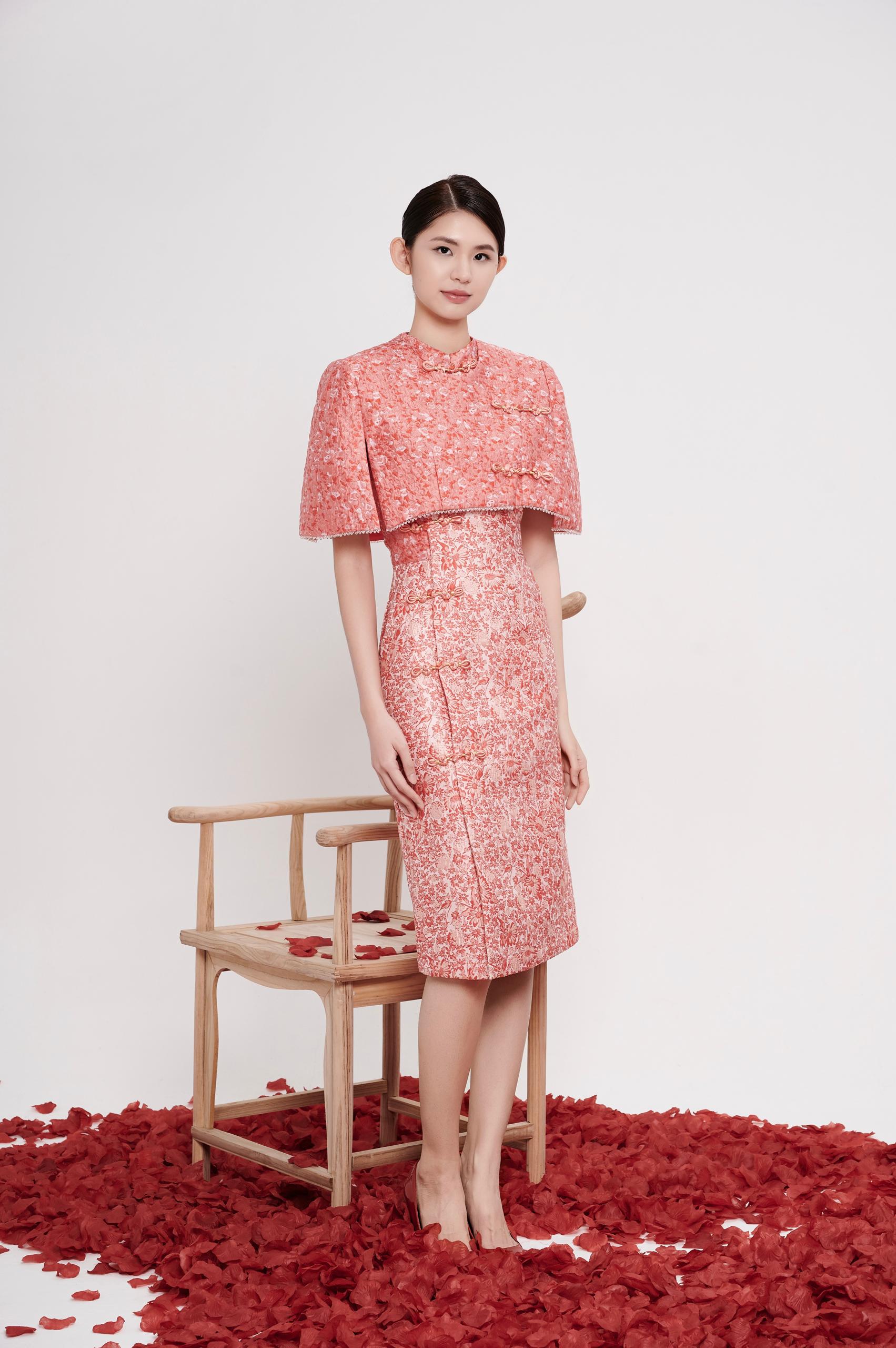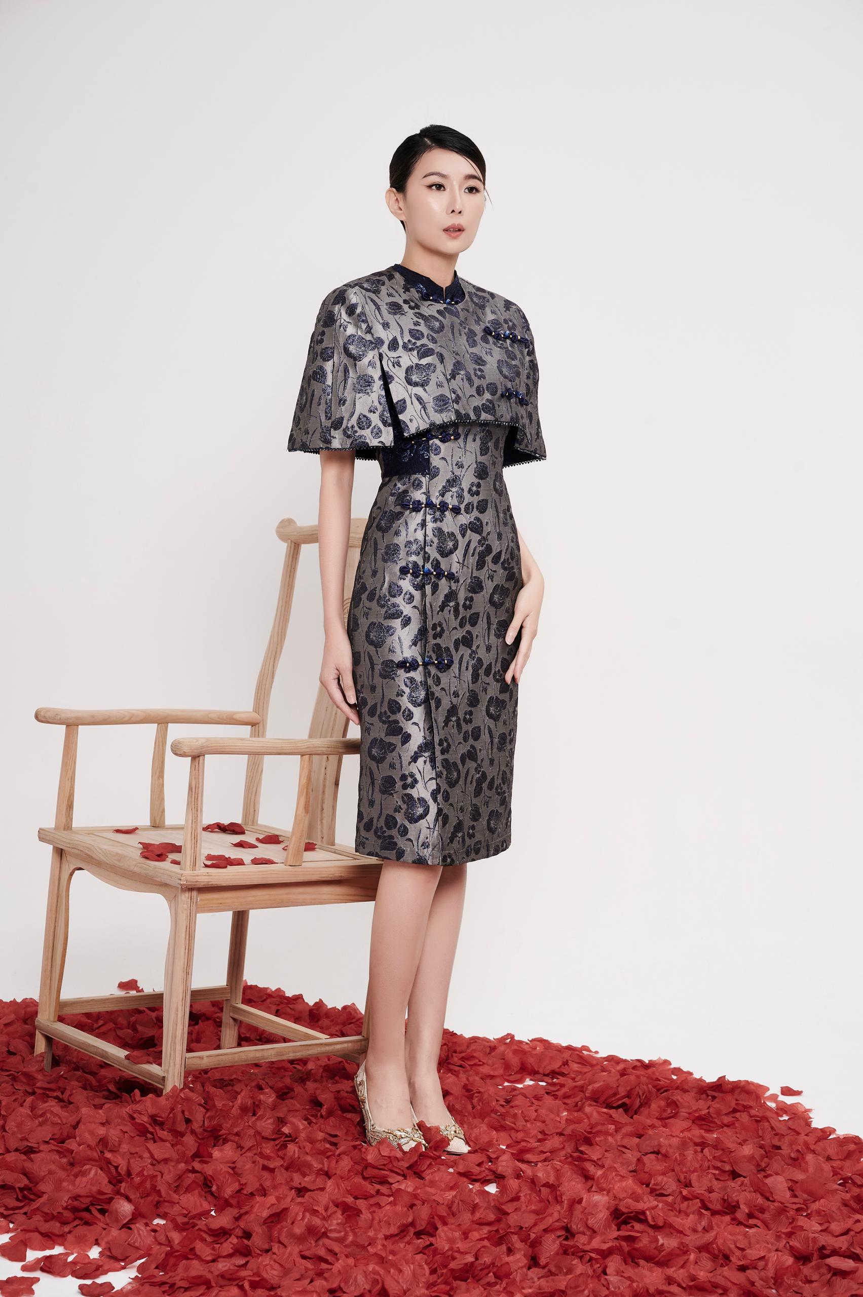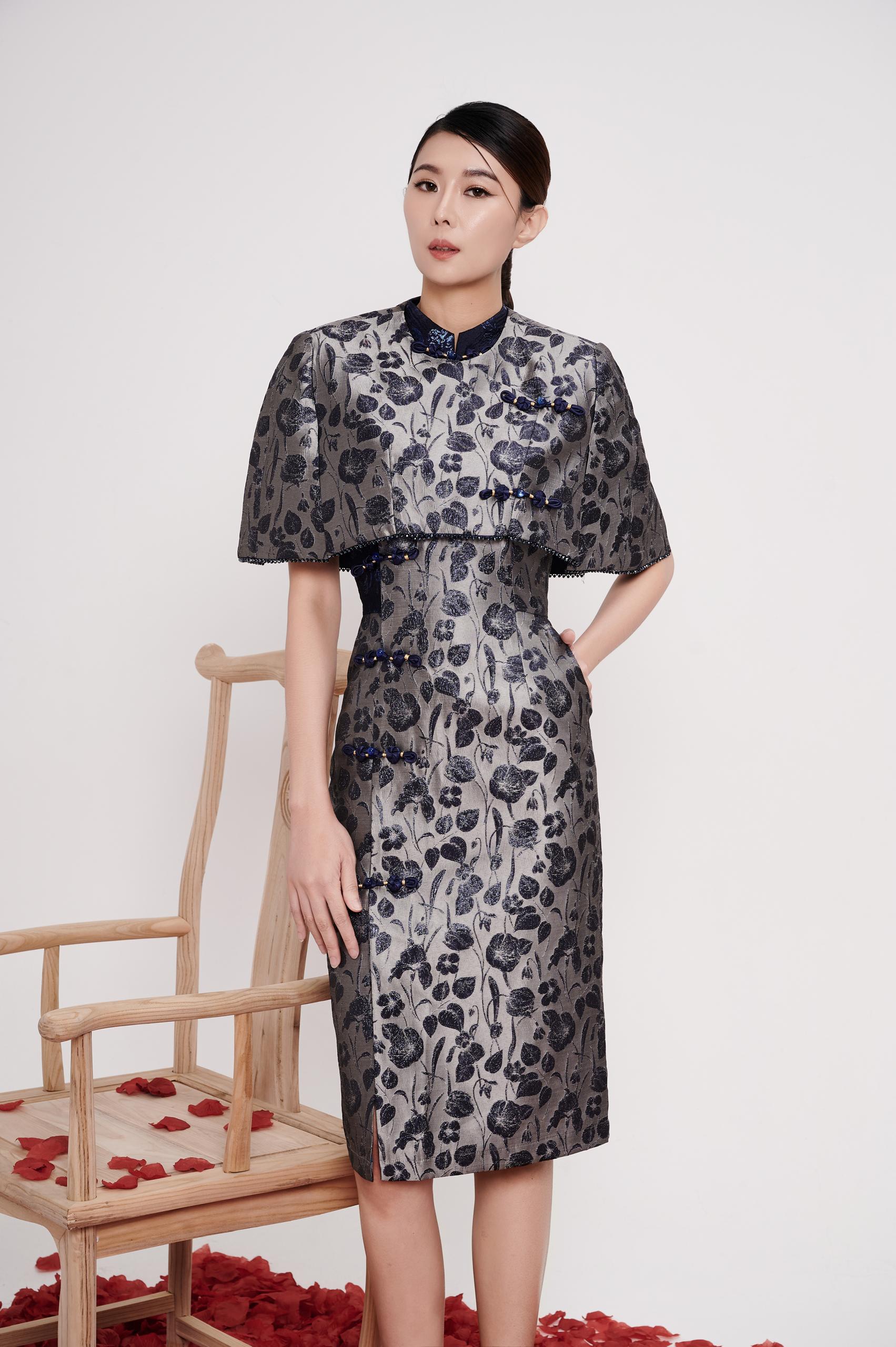 A refined cheongsam cape designed to layer effortlessly over the dress, adding depth and elegance to the silhouette. The structured drape softly frames the shoulders and upper arms, creating a graceful balance between tradition and modern sophistication.