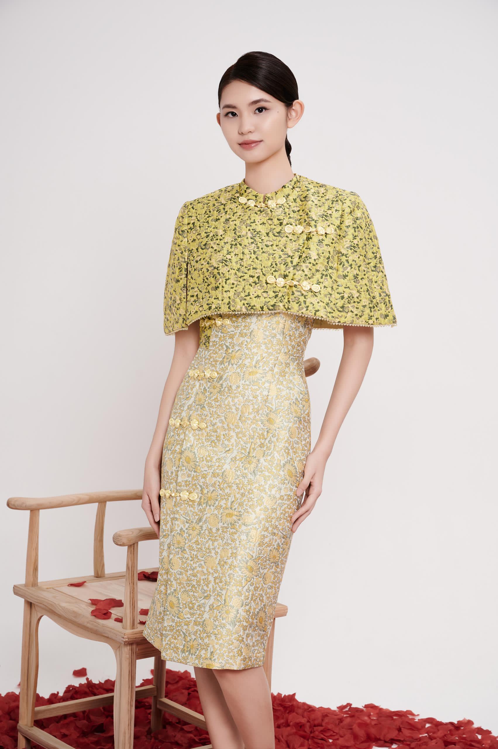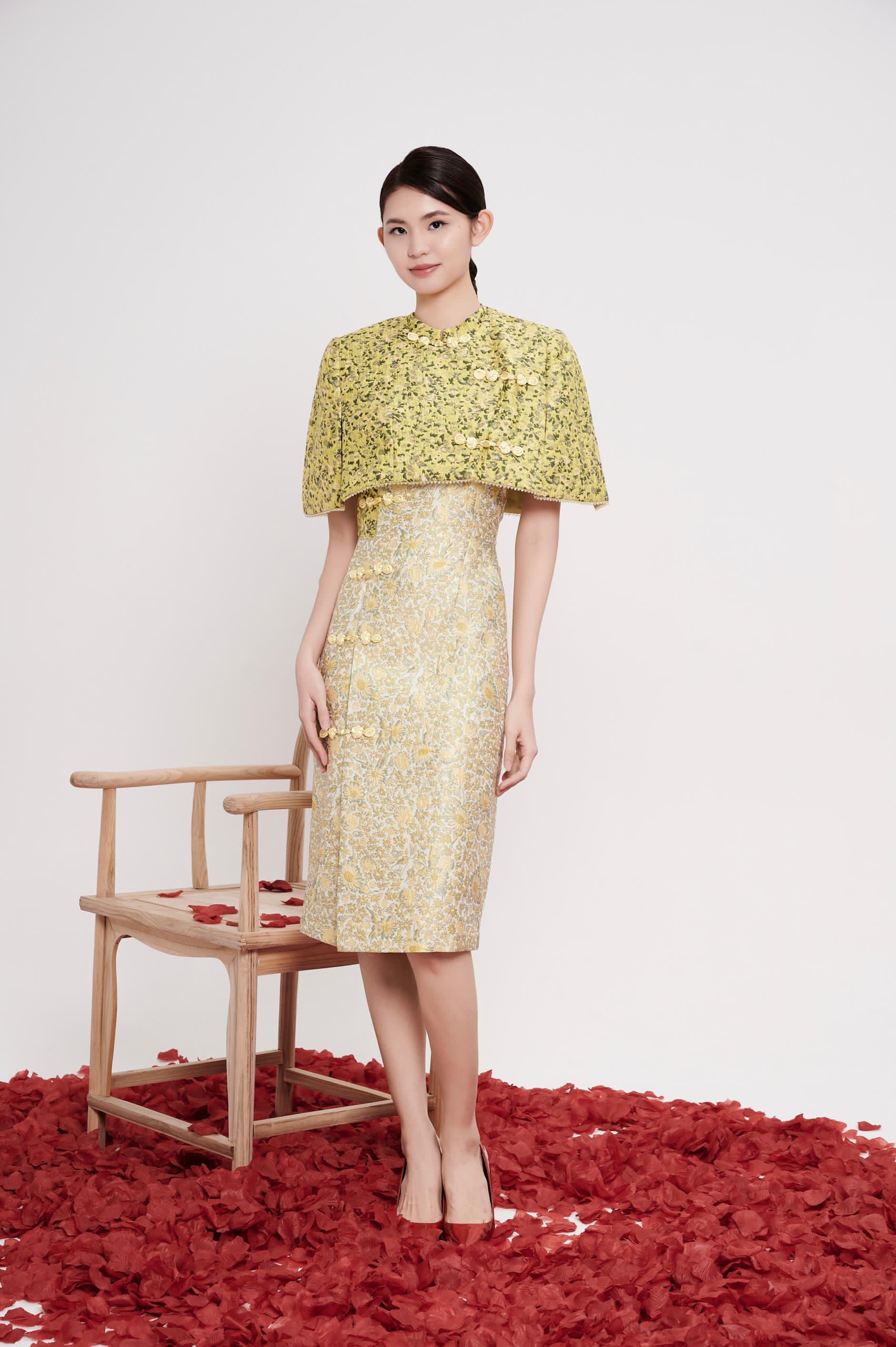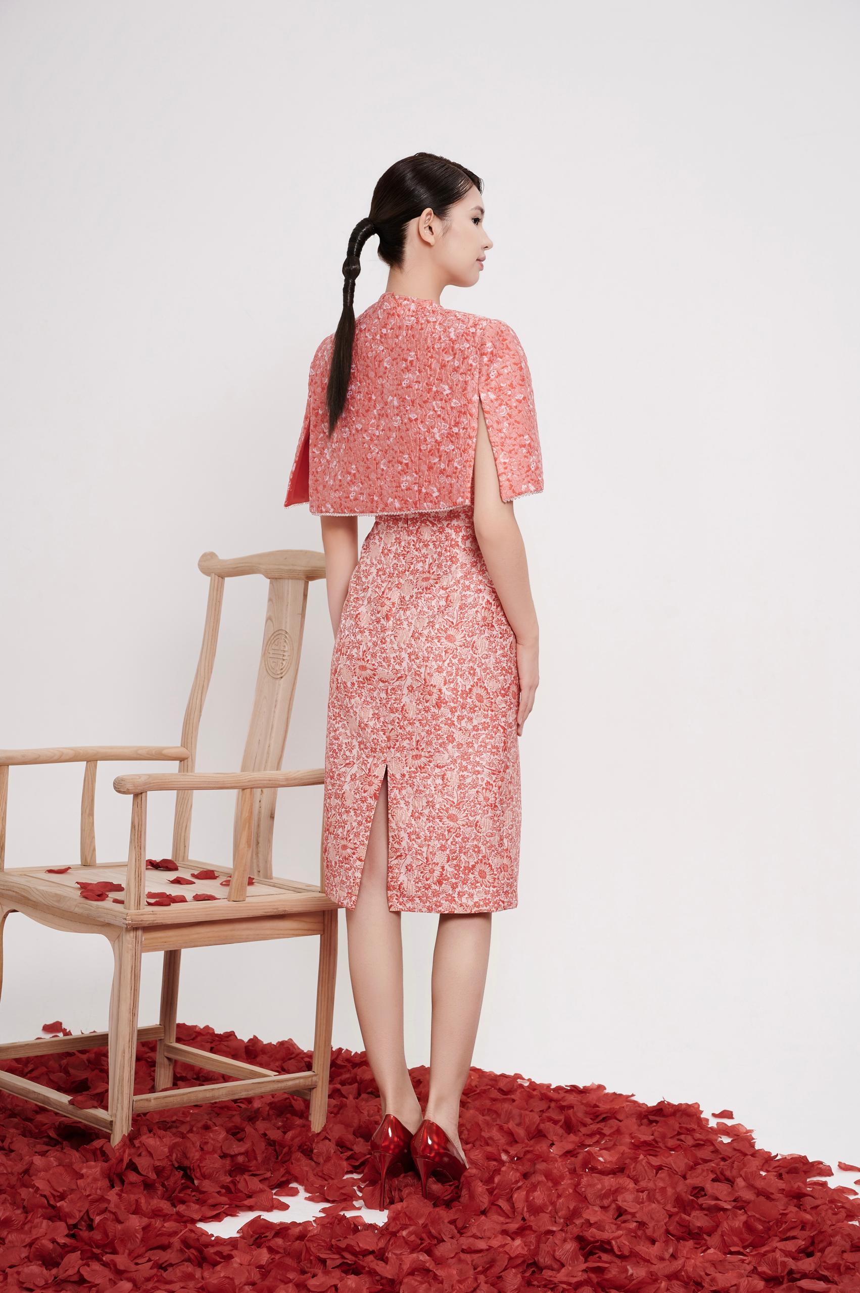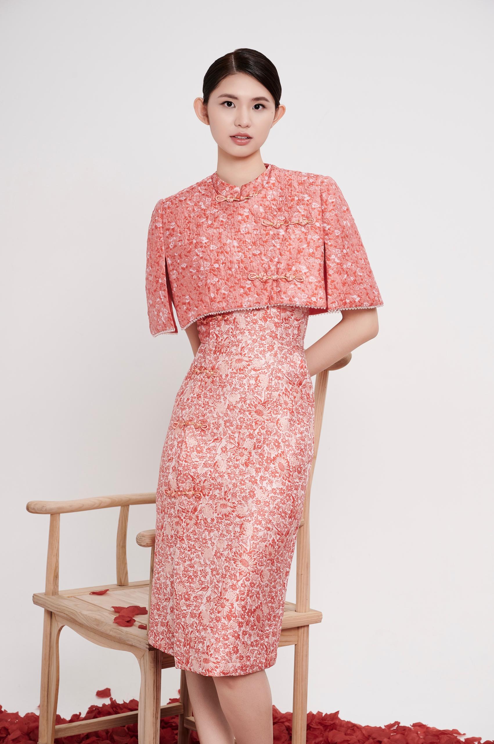 A refined cheongsam cape designed to layer effortlessly over the dress, adding depth and elegance to the silhouette. The structured drape softly frames the shoulders and upper arms, creating a graceful balance between tradition and modern sophistication.