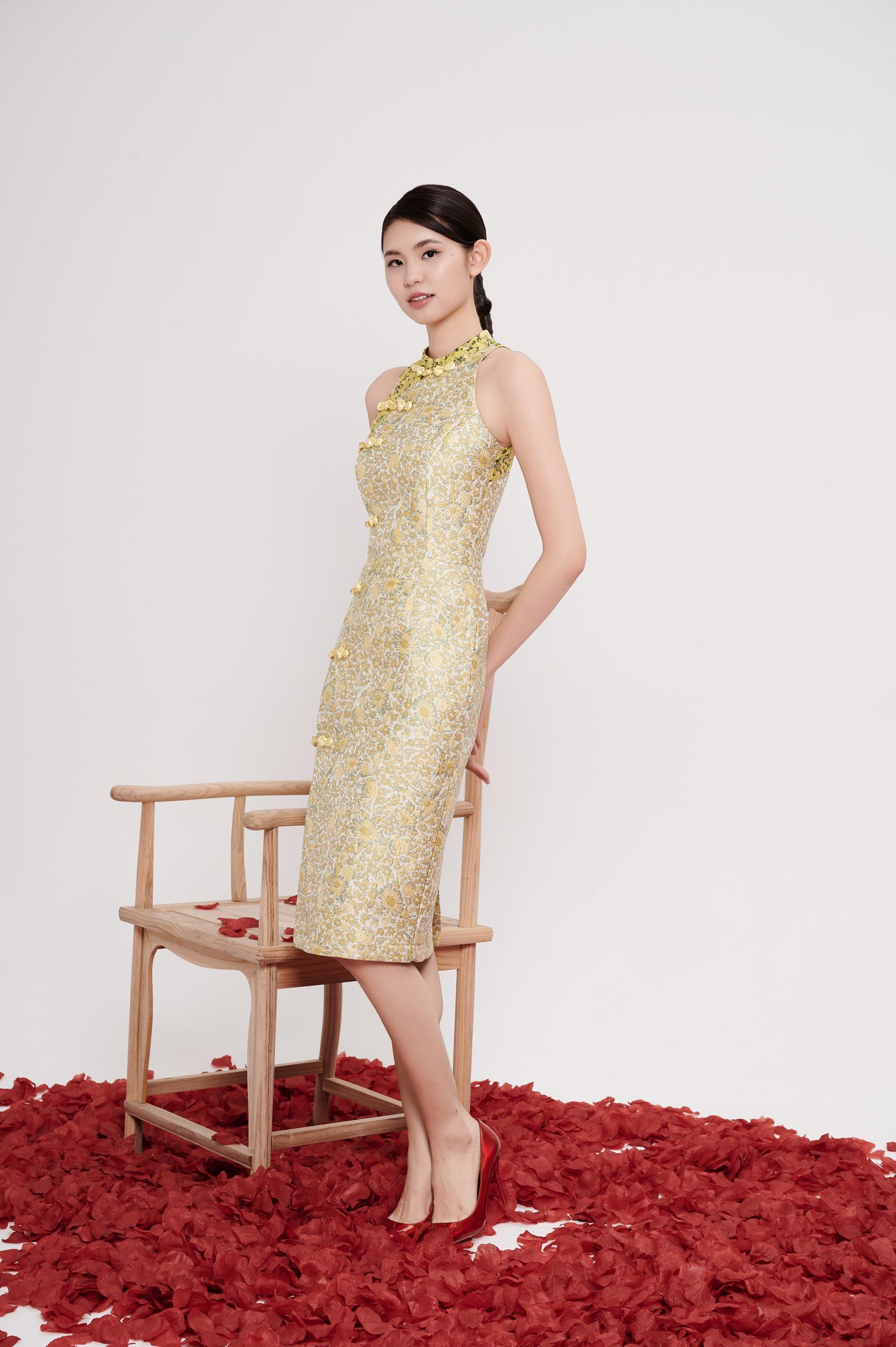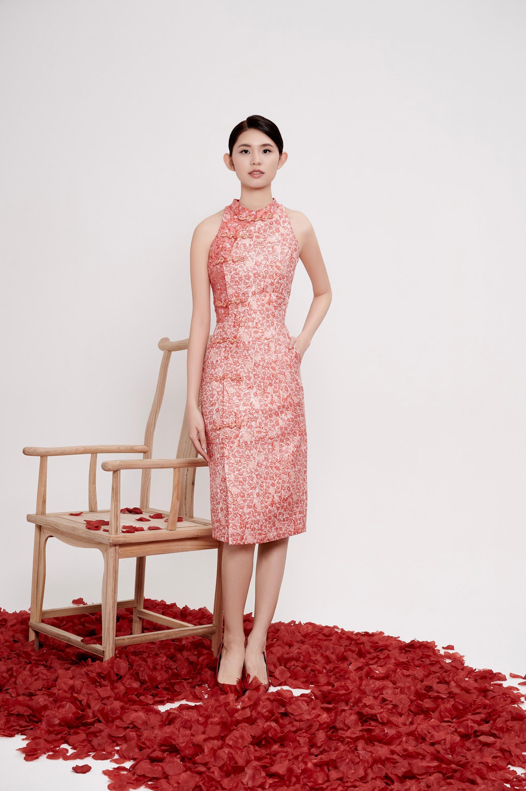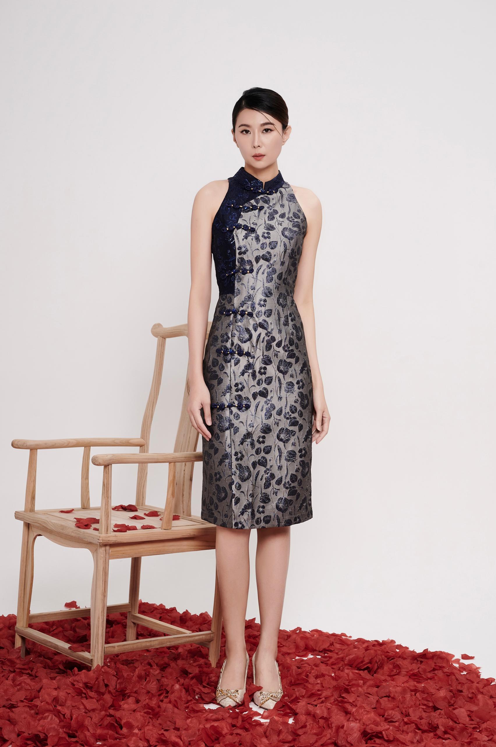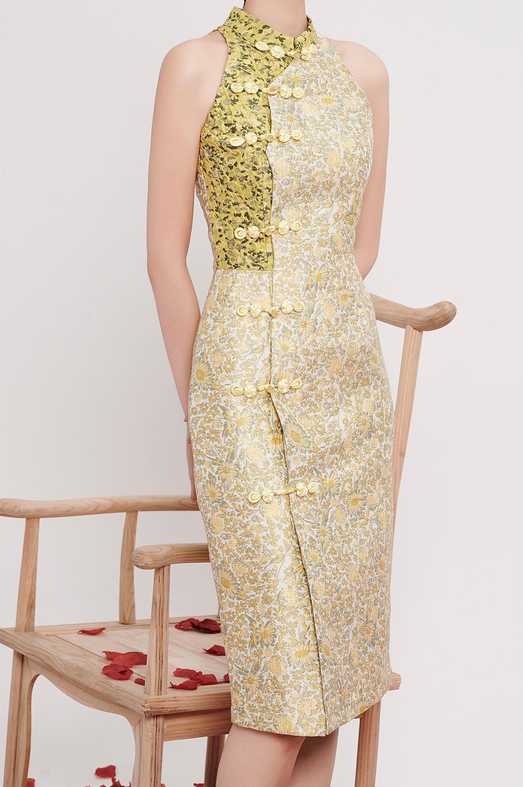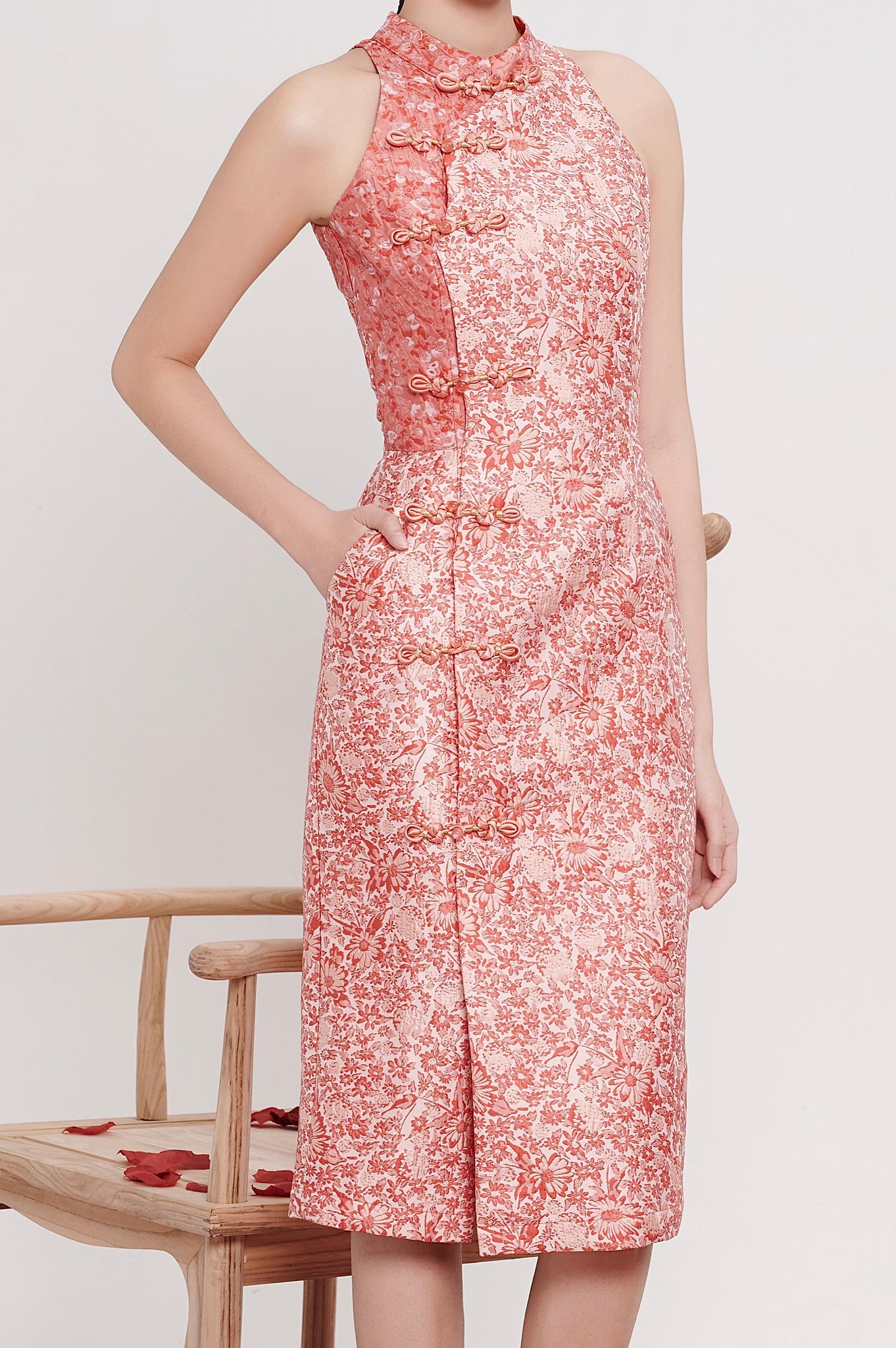 A modern interpretation of the classic cheongsam, designed with a halter neckline that elongates the shoulders and neckline for a clean, refined silhouette. Crafted in textured floral brocade, the dress skims the body gracefully, highlighting the waist while remaining comfortable and elegant.